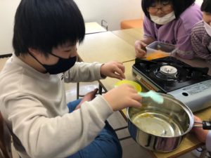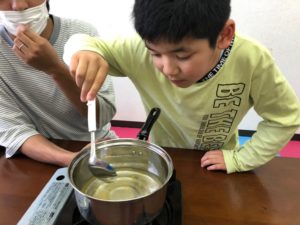 まずはゼリーの素となる粉をみんなで協力して混ぜてくれています♪