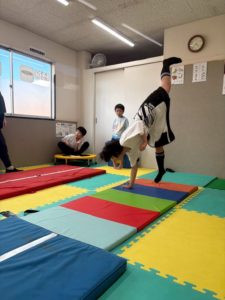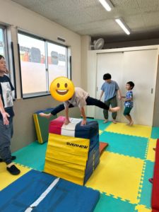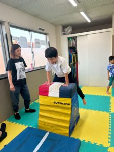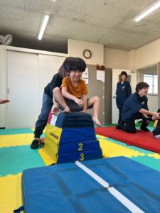 跳び箱もカエル跳びをしたり、平均台をまたいで渡ったりして練習をしたり、